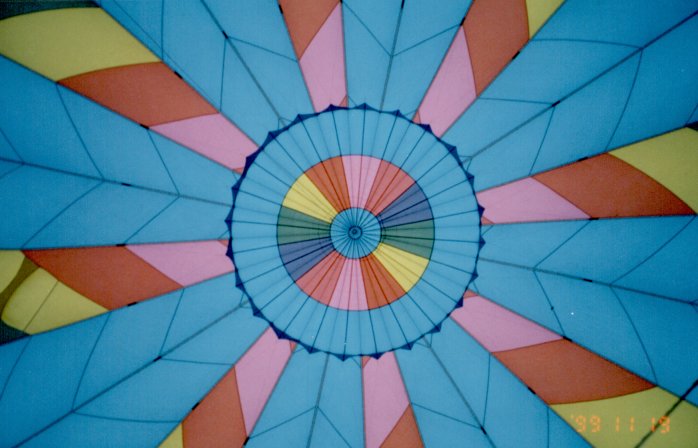 An almost perfectly symmetrical view of the crown of the balloon in flight, taken from the basket. |