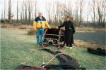 There are lots of smoke stacks visible all over the valley, and it's becoming pretty clear that the smoke below us is drifting south. Al asks if I'm planning to land, and I respond that I've decided to "go for the dollar," so I descend to try to catch that direction. When we get the sharp left turn we're looking for, I send Al back to Spring St. Interestingly, by now the wind speed lower down has picked up, and the GPS has us doing 5 or 6 mph as we head south. Jean is particularly impressed with the feeling of going a bit faster while closer to the ground, over the trees. We make our approach to Spring St. a couple of hundred feet to the east of the ball field from which we took off, over the trees, now completely bare of leaves. Our track is directly along the empty gravel parking lot and, as soon as we've cleared the tree line, still traveling at about 5 mph, I vent aggressively to land as close to the upwind side of the lot as possible, while burning to arrest the rate of descent. [When landing on an asphalt or other hard surface while you're moving at more than a couple of miles per hour, it takes longer to stop the horizontal movement of the balloon than it would on a grassy surface.] We bounce and skid a little, while I use the vent to control the balloon. Al drives onto the parking lot and runs to us, helping to stabilize the basket. We then walk the balloon about 20 yards to the grass, and deflate it, after which we take some pictures to mark the occasion of my first time landing back at my launch site. First, Jean and I pose with the deflated balloon before pack-up, then a couple of shots of Al and myself, pointing out our proximity to your launch point. Robert and his passengers and crew arrive for their post-flight champagne celebration just as we're getting ready to put the equipment back on the trailer, so we have eye-witnesses! |
