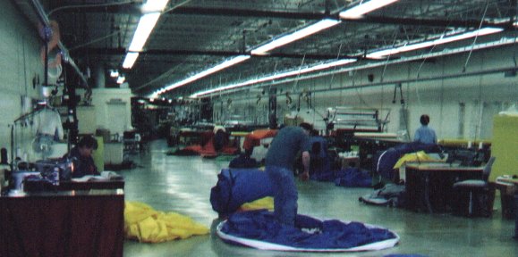 The remainder of the process consists of a lot of sewing, using industrial double-needle sewing machines. You can see several sewing stations on the factory floor, allowing multiple balloons to be built at once. |