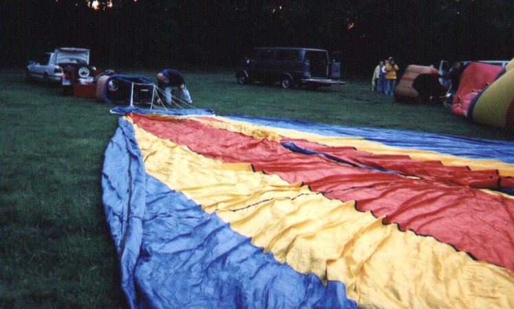 ...and we get to work assembling the various components, and color-coding the carabiners and their attachment points on the envelope for future convenience in set-up on the launch field. |